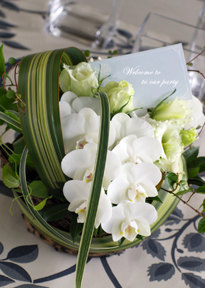 葉ものをモダンにデザインして、白い胡蝶蘭やバラをあしらいました。上質で豪華な花飾りを受付に飾りませんか。テーブル飾りとしてもお使いいただけます。