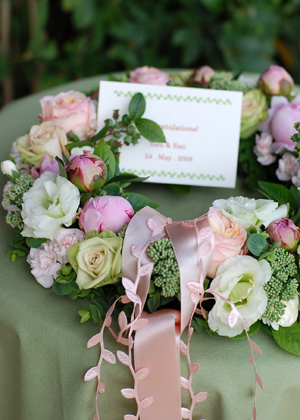 リース型アレンジメントの真ん中に‘Welcome to ~’のカードを差し込んで、ウエルカムボードの代わりに、入り口のテーブルの上に置きましょう。お帰りの際には、大切なゲストへの贈りものにもなります。 芍薬を使わず、バラなど1年中入荷する花材であれば、季節を問わずお作りできます。色違いのご注文にもお応えできます。