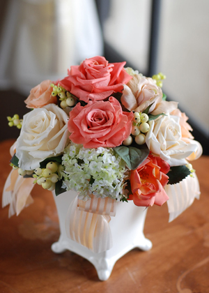 サーモンのバラがアクセントになった、ポットアレンジメント。2種類のリボン使いがきまってます。直径20cm×高さ20cm。