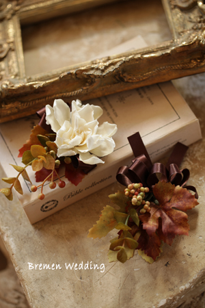 結婚式に列席される、ご両親や御兄弟、ご友人のために作られた、コサージュです。季節に合わせて、コーディネートいたします。男性用には、よりシンプルに葉や実ものだけでも素敵です。女性用には、1輪のお花をあしらって。