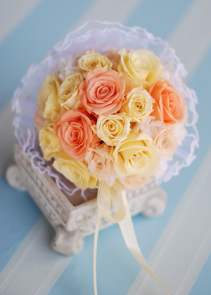 パステル系のオレンジバラやイエローバラを小さなブーケにしました。レースのフリルがまたキュートです。
