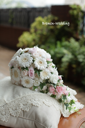 白いガーベラをメインに、淡いピンクのバラをプラスしたキャスケードブーケです。挙式用にどうぞ。