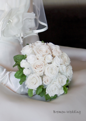 白いバラに、ほんのり淡いピンクのグラデーションが美しいプリザーブドのラウンドブーケです。。