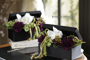 黒い布張りのボックスに、和風のお花をアレンジして・・・。お部屋のインテリアに合わせて、お花の色の変更は可能です。贈呈用にいかがでしょうか。