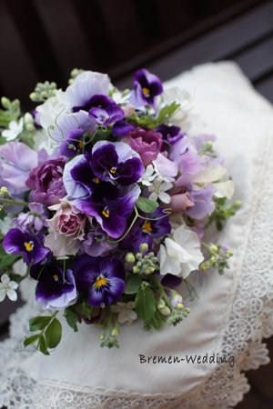 すみれ色って、とても夢があってロマンティックな色ですね。春ならではのパンジーを使ったブーケ2点。白いドレスや大人ピンク系のドレス、ネービーなど深い青いドレスなどとの相性がぴったり。可憐なパンジーのブーケは、いかがですか?