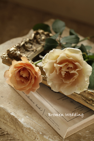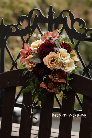 深い秋を想わせるような・・・、深いボルドーカラーのダリアとアンティーク色のバラ。そんなお花で作ったブーケです。バラは、「エバンタイユ・ドール」と「ラフィネ・ポルテ」。平咲きの美しいバラですね。シックなアンティークカラーのブーケは、いかがでしょうか。