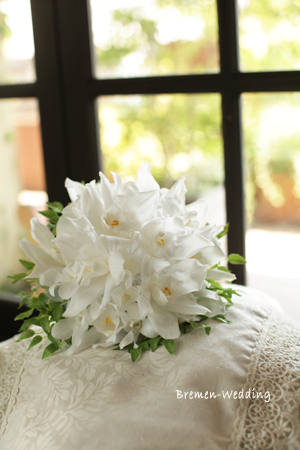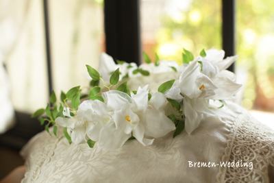 ハワイやグアム、沖縄。リゾートで挙げる結婚式が人気ですね。そんなリゾート婚におすすめなのが、プリザーブドフラワーのブーケです。今回は、ラン2種とグリーンがさわやかなラウンドブーケとお揃いの花冠をご紹介いたします。南国のイメージにぴったりなウェディングブーケは、いかがでしょうか?