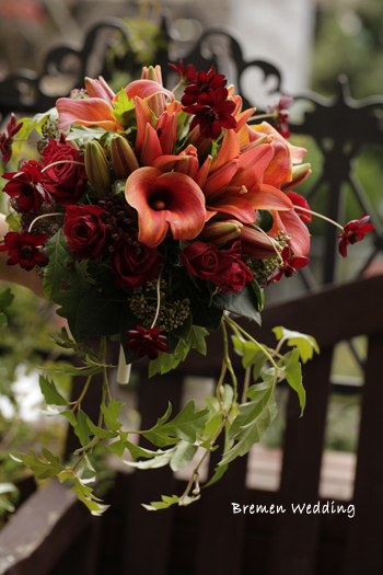 マンゴー色から深い赤のグラデーションが美しいカラーと、この季節にぴったりな深紅のバラで構成されたブーケです。葉ものはナチュラルに下に流れて・・・、ドレスにフィットしますよ。白いドレスにも、カラードレスにも、どうぞ。
