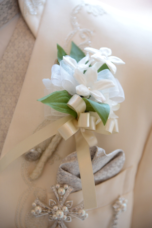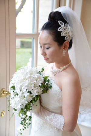 白い星の形をしたお花、ジャスミン。愛らしいジャスミンだけでお作りしたティアドロップブーケです。お揃いのブートニアもジャスミンで。可憐なお花は、ティアドロップブーケにぴったりです。