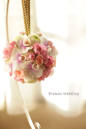 和装の花嫁さまに人気の和装ボールブーケです。コチョウランを使って、上品に愛らしく・・・。洋髪にお揃いのヘッドドレスがおすすめです。
