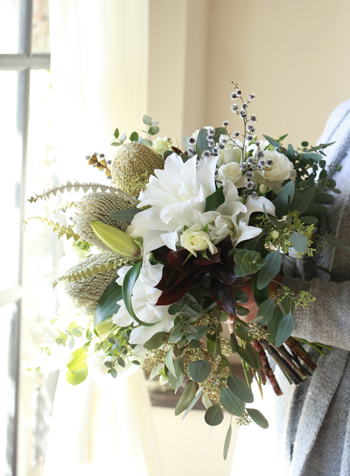 今回お作りしたのは、オーストラリアのネイティブフラワー「バンクシア スペシオサ」と八重咲き白ユリ「マイウェディング」をメインにした個性的でエキゾティックなブーケです。nakedの上半身が隠れるくらいの大きさで、お写真はモノクロになるそうです。生まれてきた赤ちゃんが成長された時にも見る楽しみがありますね。