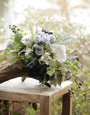 そしてもう1つは、ネービーの大輪花にミストブルーという、ちょっと大人の雰囲気のあるナチュラルブーケ。お色直しにもお勧めです。