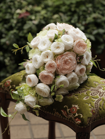 1つはガーデンローズを思わせる華やかでゴージャスなキャスケードブーケです。優しいアプリコット色と爽やかなグリーンのローズをたっぷりとあしらったブーケです。