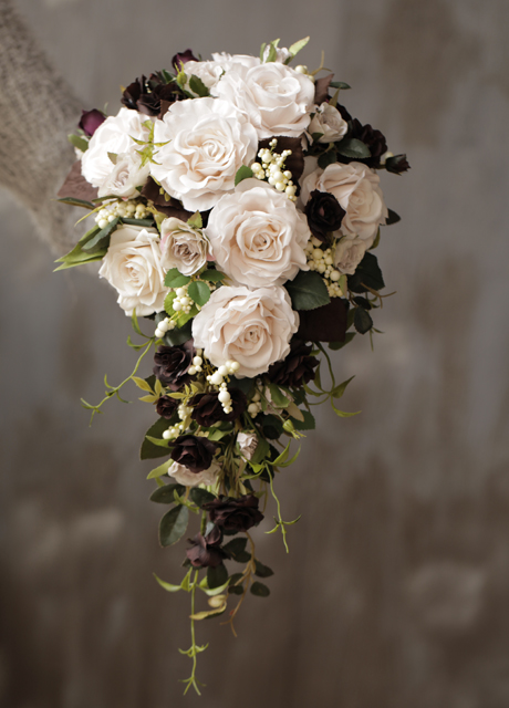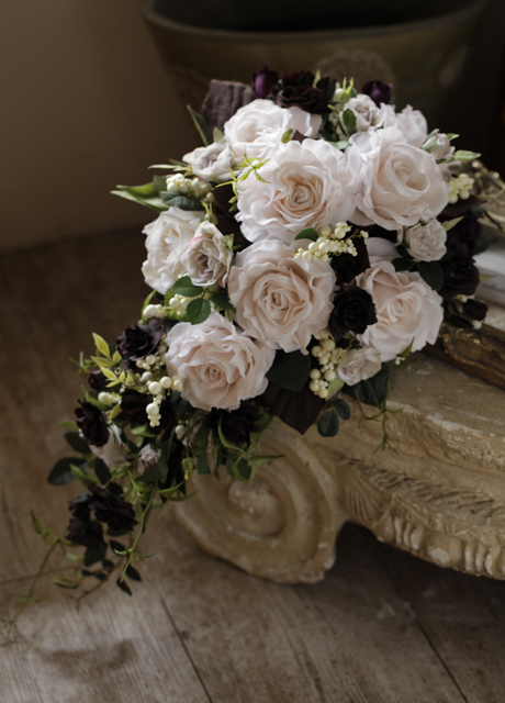 個性的なノアールローズを散りばめたキャスケードブーケは、こだわりの花嫁さまにぴったりです。アーティフィシャルでお作りしていますので、持ち運びも安心。挙式後は、思い出の大切な品として新居にお飾りいただけます。