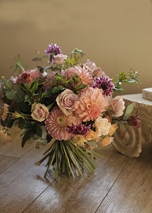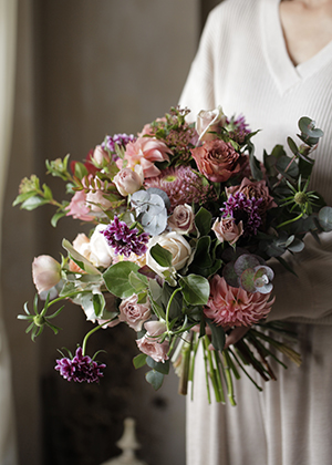 花嫁さまのご希望は、大きなダリアを使ったラウンド型のクラッチブーケ。きっちりとした形ではなく、少しくずしたナチュラルなブーケ。上質なオフホワイトのドレスに落ち着きのあるシックなピンクやボルドーの色彩で。